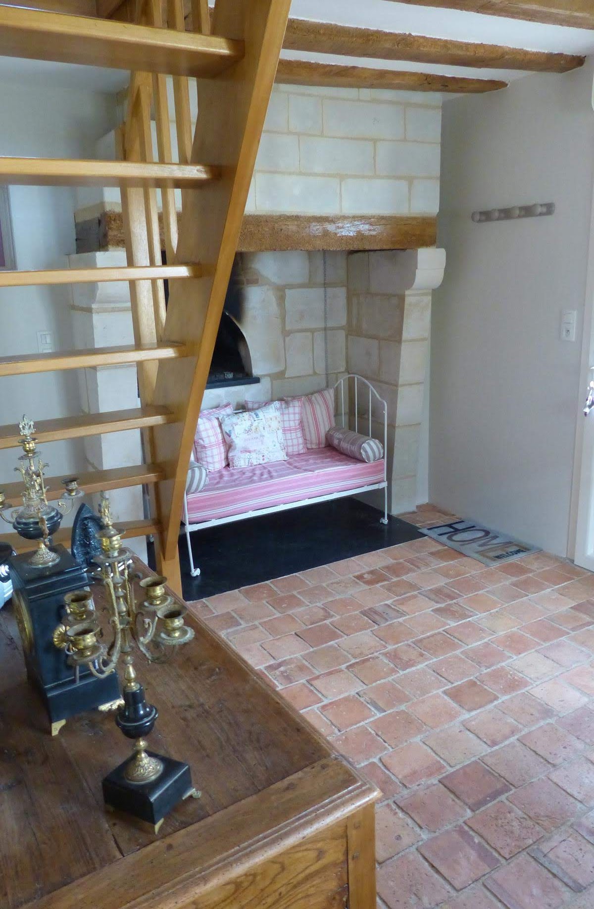 Les équipements – salle d’eau, cuisine aménagée, plancher chauffant par géothermie – s’intègrent dans le décor traditionnel des pièces : poutres de bois apparentes, ancien four à pain, plancher en carreaux de terre cuite.